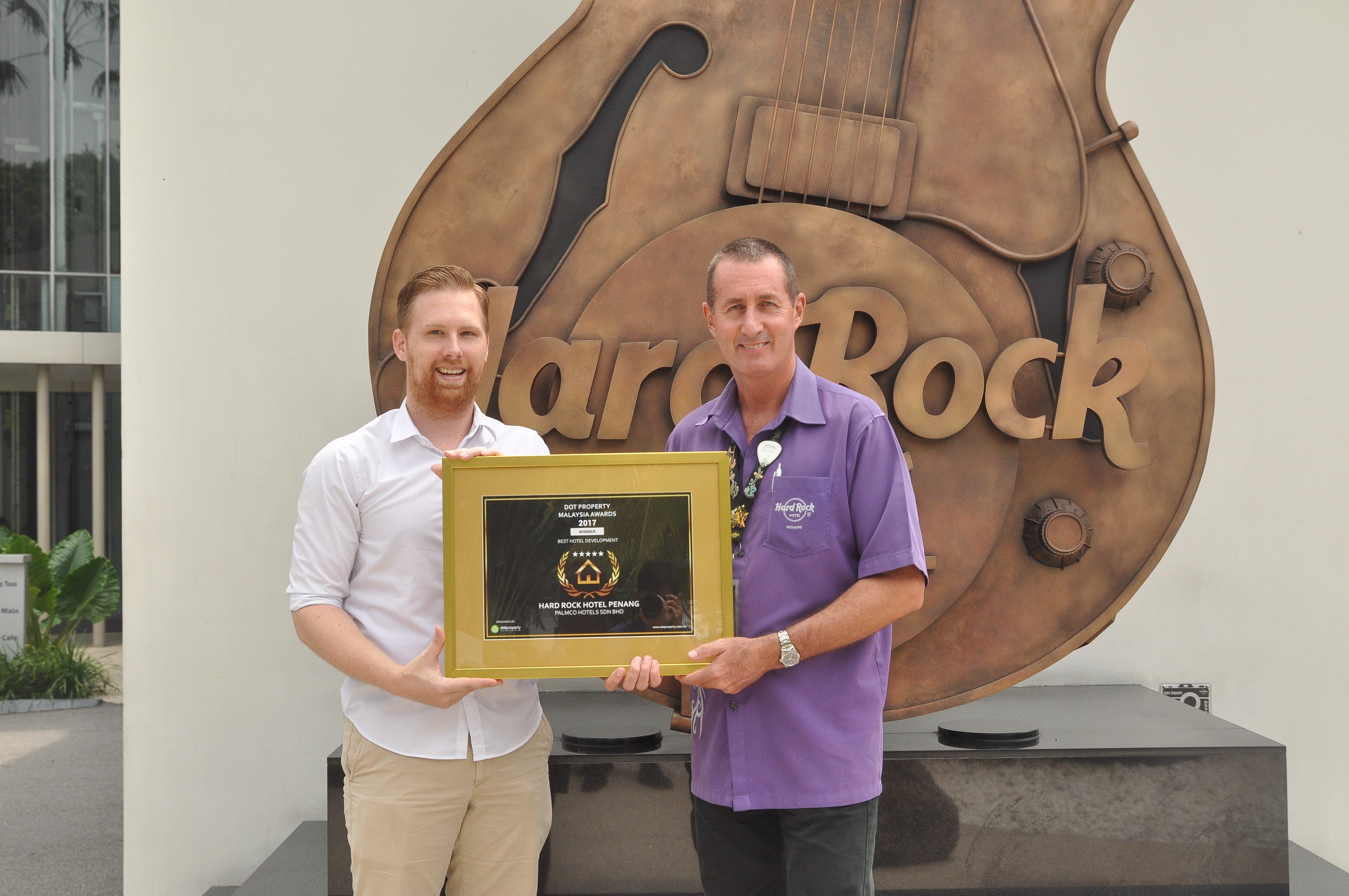 John Primmer (right), Hard Rock Hotel Penang General Manager recieves the Best Hotel Development Awards from Dot Property Magazine Editor in Chief Cheyenne Hollis (left)